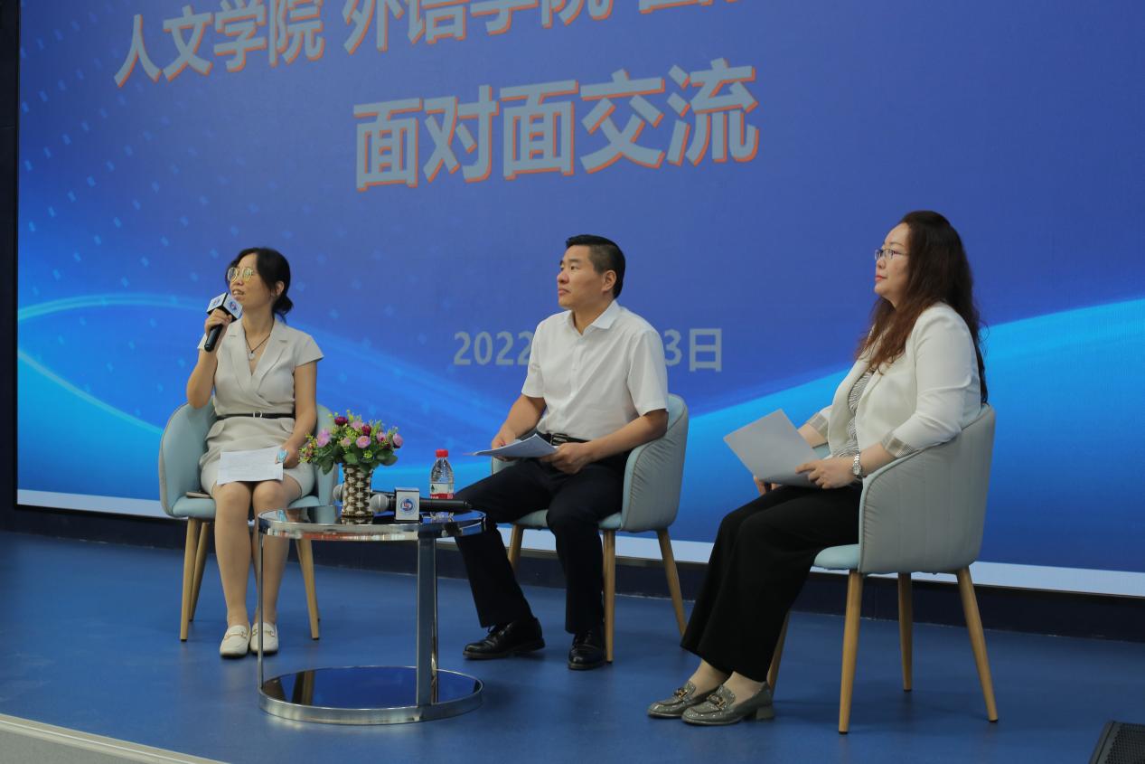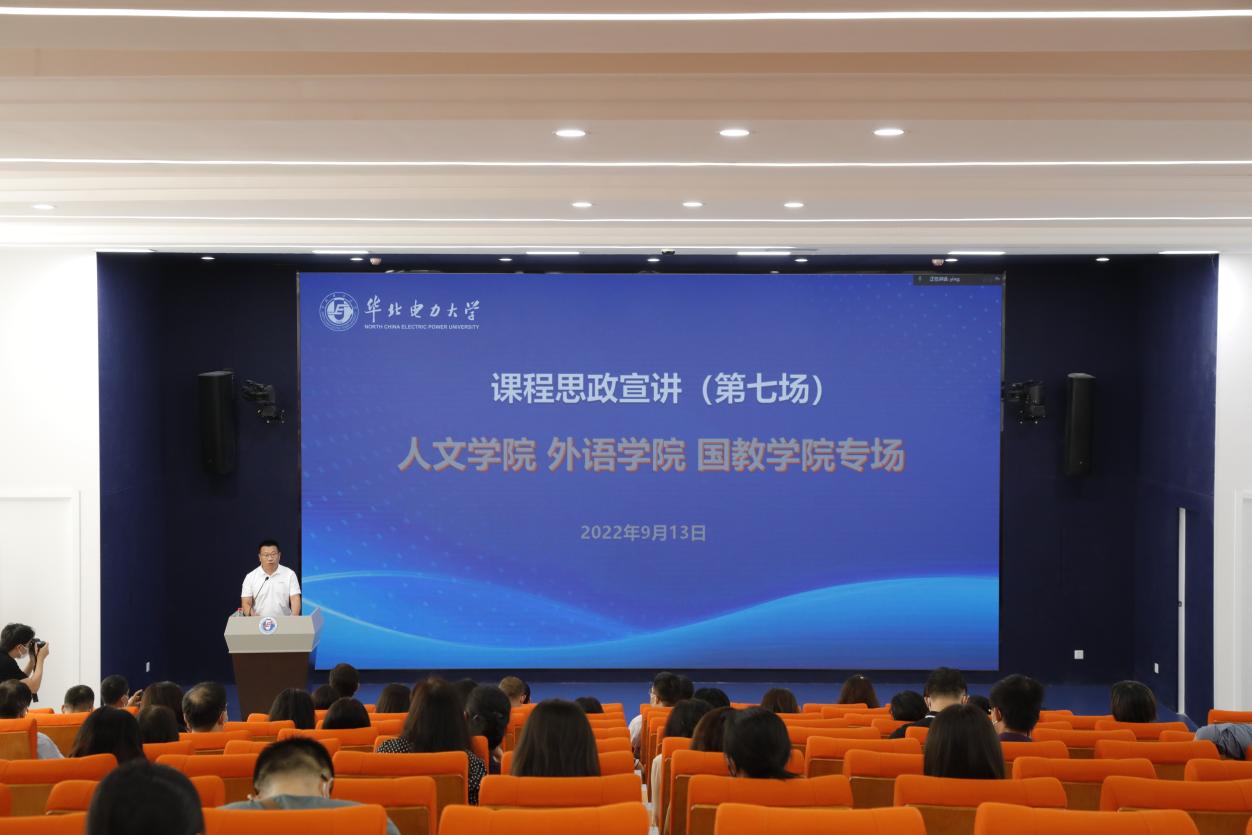 为落实立德树人根本任务,推进课程思政高质量建设,9月13日下午,课程思政宣讲(第七场)人文与社会科学学院、外国语学院、国际教育学院专场活动在教一楼14阶报告厅成功举办。本次课程思政宣讲会由外国语学院党委书记于喜海、国际教育学院党委书记徐玲玲主持;人文与社会科学学院党委书记苑英科致辞;邀请马克思主义学院王伟院长、外国语学院刘辉副院长作专题报告。教务处副处长张栋峰和三个学院全体领导班子成员和教师通过线上线下相结合的方式参加本次宣讲会。