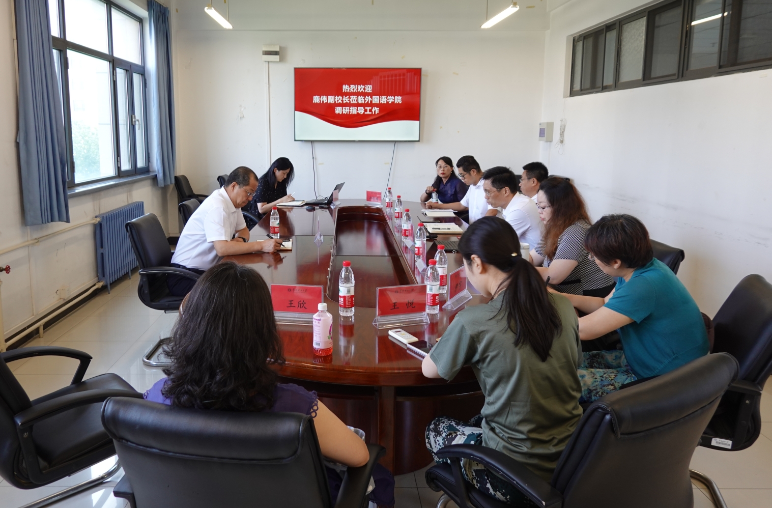 2023年7月4日14:30,学校党委常委、副校长鹿伟到外国语学院进行调研指导工作。学院领导班子成员、党委委员、党支部书记代表参加座谈会。