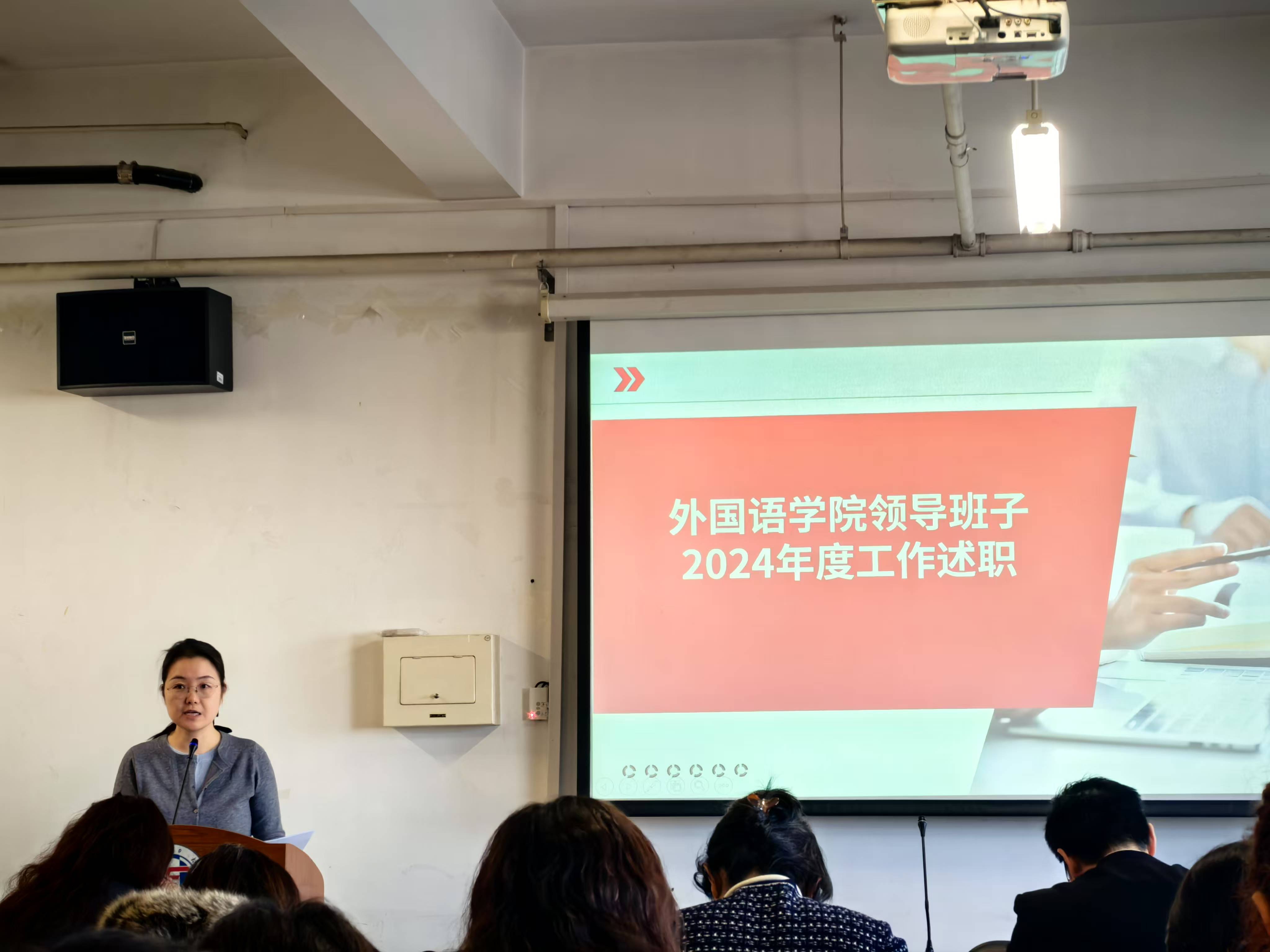 2025-02-271月7日上午10时在主C606,外国语学院召开教职工大会暨领导班子2024年度述职会议,全体教职工参加会议,会议由学院党委副书记马冬主持。 学院党委书记郑凯首先就本次领导干部述职考核的内容、程序等进行了说明,随后院长康建刚代表学院领导班子向全体教职工述职。他围绕党建引领、教育教学、科研创新、学生就业、国际合作与交流等多个方面,回顾了学院在2024年的发展,并对未来发展进行了展望,学院在2025年会继续深入学习贯彻党的二十届三中全会精神,落实全面从严治党主体责任,推动“十四五”规划指标落...